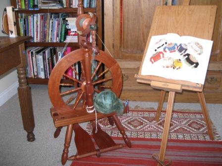 I love to read while I spin. It finally occured to me to use my painting easle to hold a book—its perfect! Today’s book selection: Everyday knitting: Treasures from a Ragpile by Annemor Sundbø. This is my second time reading this book cover to cover—one of my favs.