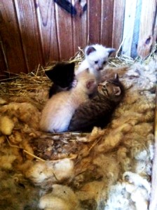Our farm has twelve barns, so barn cats are a necessity. Outdoor cats without enough to do can disrupt native ecosystems, but our cats usually stay busy patrolling grain-stores and hay-mows. So, I often put piles of skirted wool in the places used as nurseries by the mother cats. Right now, there is a little cat family living in The Office. My great-grandfather, Urbane Carter, used this space to settle sales during livestock auctions held on the farm during the 1950’s. The cats find it is a grand place to hide kittens.